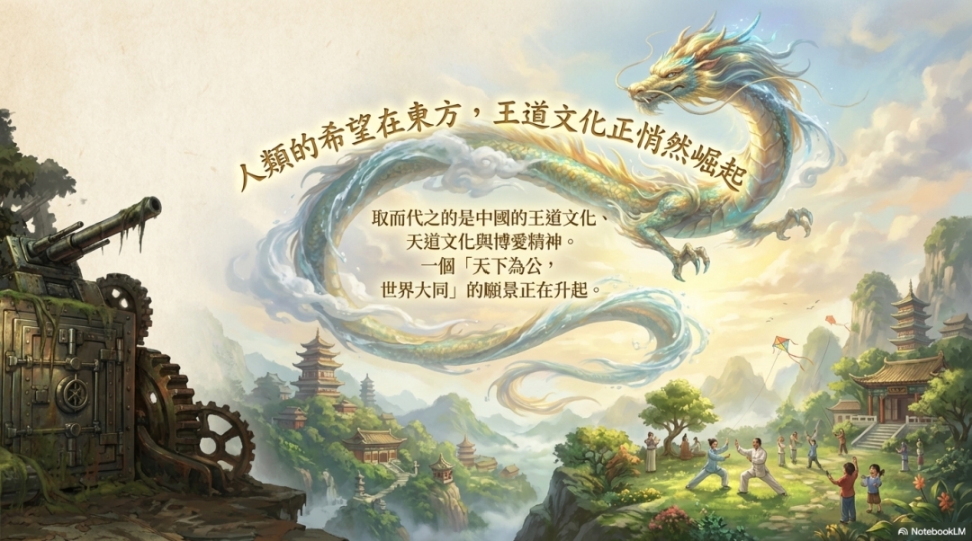 取而代之的是中國的王道文化 天道文化與博愛精神。 一個「天下為公, 世界大同」的願景正在升起。