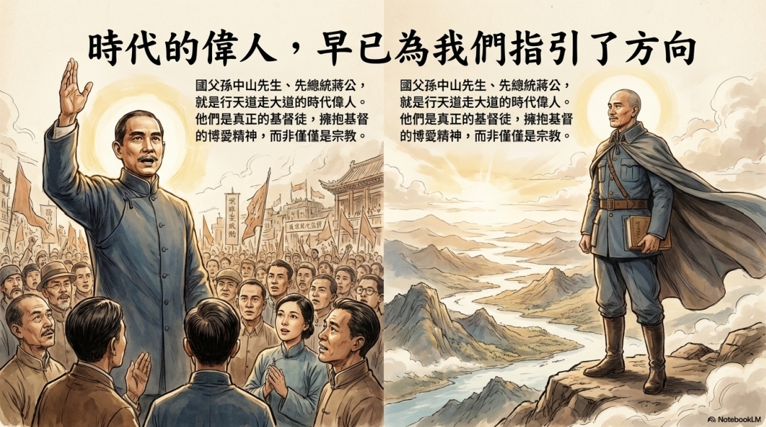 國父孫中山先生、先總統蔣公, 就是行天道走大道的時代偉人。 他們是真正的基督徒,擁抱基督