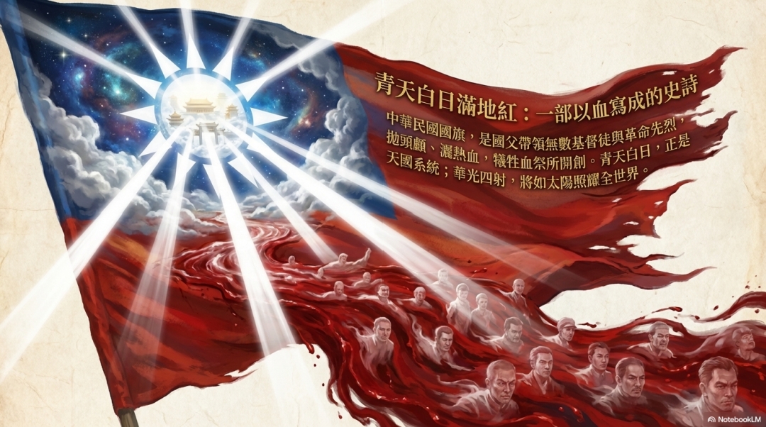 中華民國國旗,是國父帶領無數基督徒與革命先烈, 拋頭顧、濕熱血,犧牲血祭所開創。青天白日,正是 天國系統;華光四射,將如太陽照耀全世界