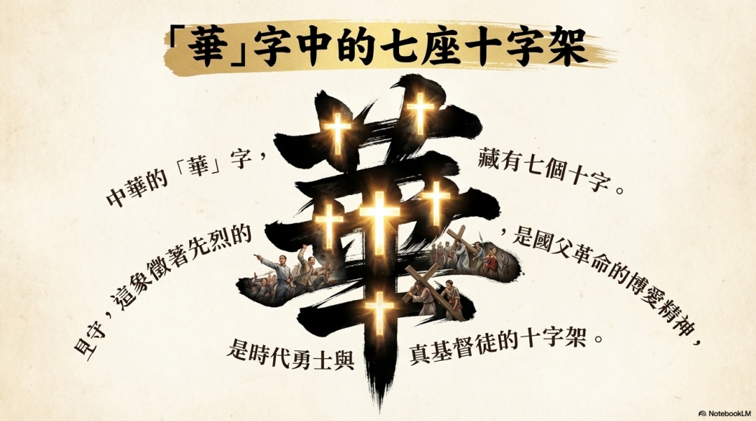 中華的華字,總共有7個十 字,就是先烈的捨身流血,就是 國父革命的博愛精神,就是時代 勇士,武士真基督徒,這才是十字 架