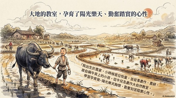 「我出生於農家,小時候是位牧童,並從事農作、農耕 故自稱牛背上的小孩。從牛兒及農作大自然教室, 學習孕育我。陽光樂天胸懷、勤奮刻苦踏實心性。」