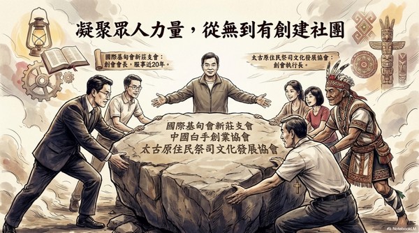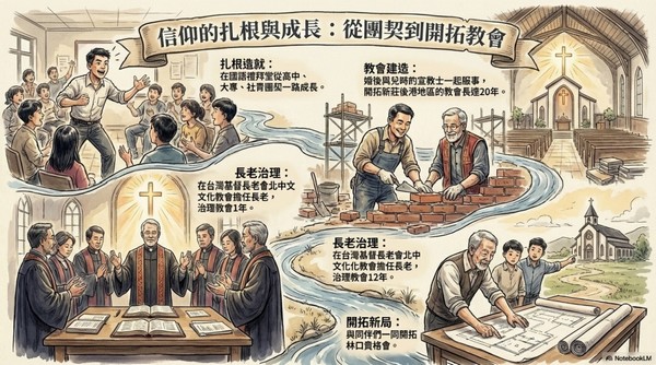 介紹他信仰的啟蒙:「小時候就從宣教 土聽到福音,在高中時信主受洗, 之後就一直在教會有服事30年以上。」 這不僅是信仰的開始,更是長達數十年 服事之路的起點。