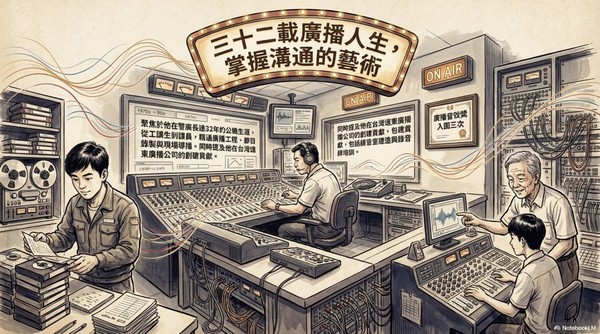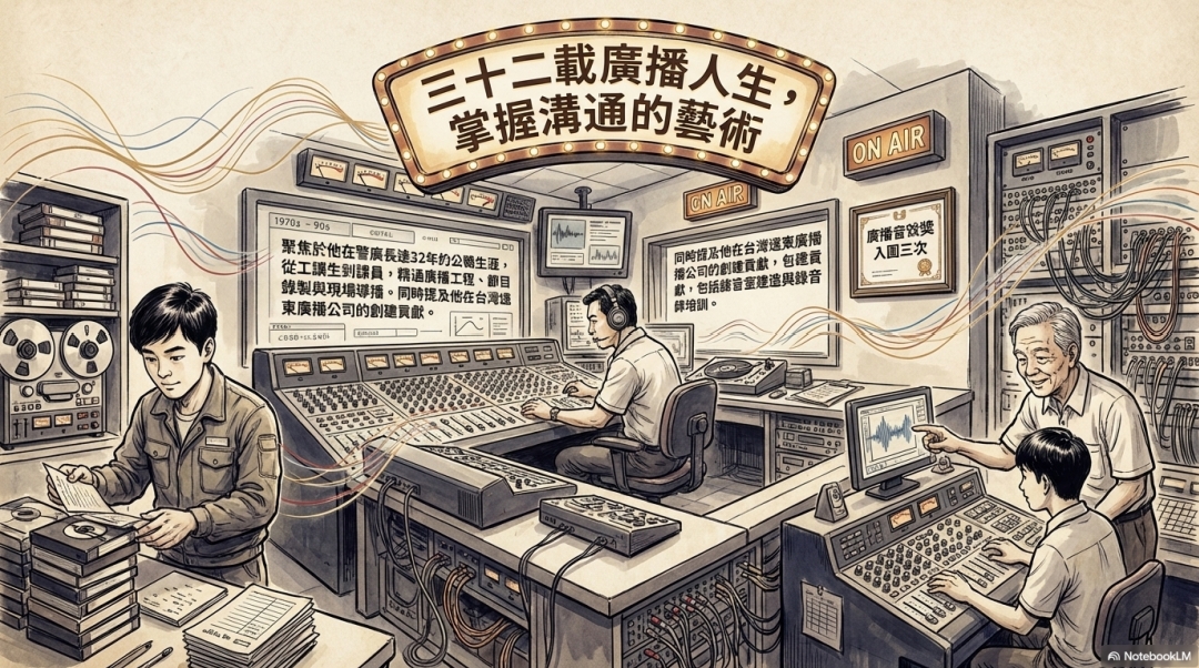 聚焦於他在警廣長達32年公生涯, 從工讓生到課員,精通廣播工程、節目 錄製與現場導播。同時提及他在台灣遠東廣播公司的創建貢獻。
