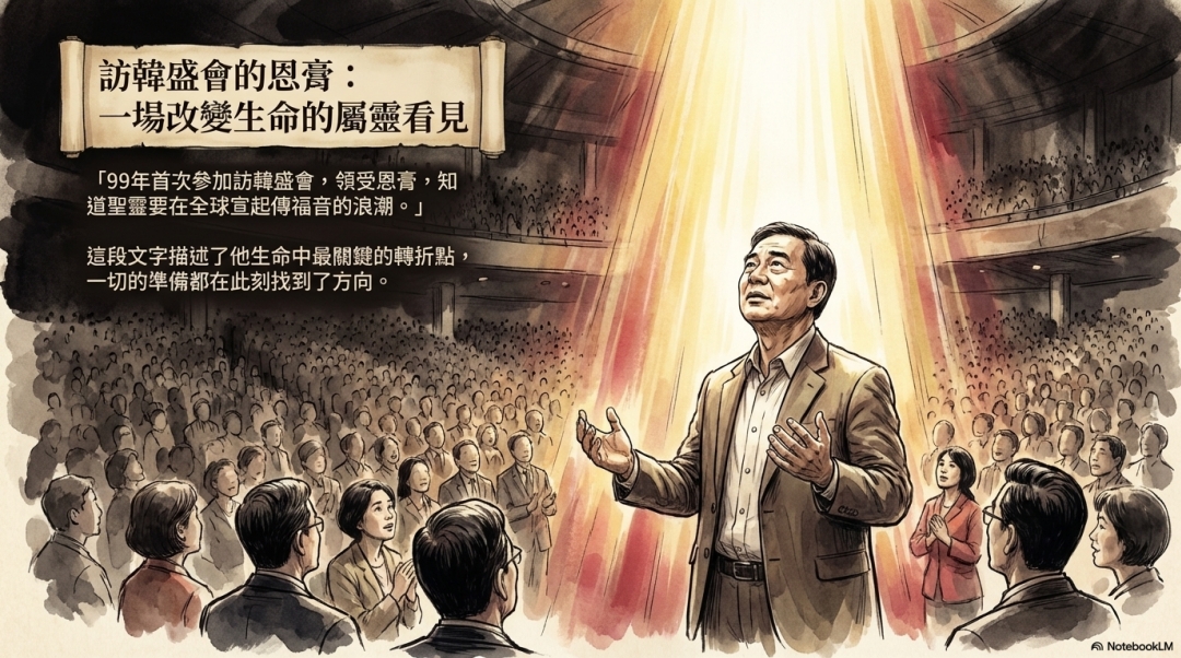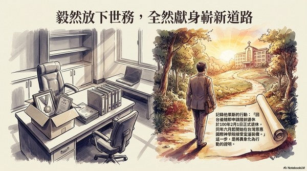 記錄他果斷的行動:「回 台後隨即申請前退休 於100年2月1日正式退休, 同年六月起開始在台灣恩惠 國際神學院接受宣道裝備。」 這一步,是將異象化為行 動的證明。