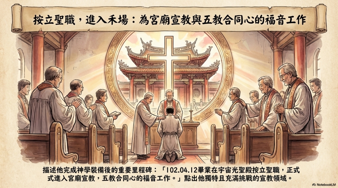 「102.04.12畢業在宇宙光聖殿按立聖職,正式進入宮廟宣教,五教合同心的福音工作。」點出他獨特且充滿挑戰的宣教領域。