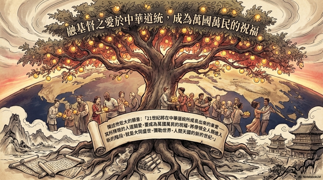 關述他宏大的願景:「21世纪將在中華道線所成長出來的果實其所陳現的人道關愛,要成為萬國萬民的祝福,將帶領全人類進入新的階段,就是大同盛世、彌勒世界、人間天國的新的世紀。」