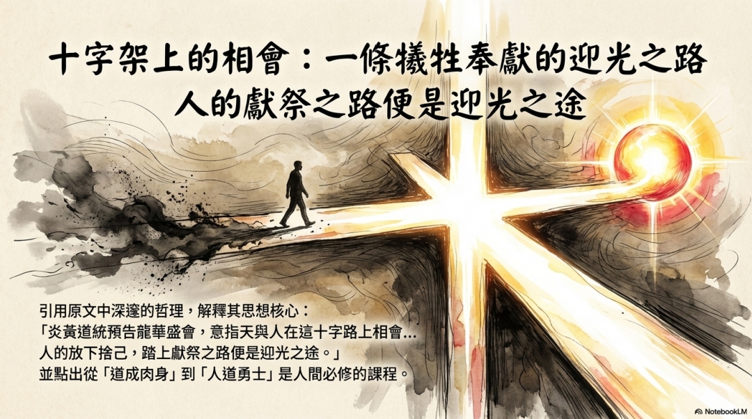 引用原文中深邃的哲理,解釋其思想核心: 「炎黃道統預告龍華盛會,意指天與人在這十字路上相會... 人的放下捨己,踏上獻祭之路便是迎光之途。」 並點出從「道成肉身」到「人道勇士」是人間必修的課程。